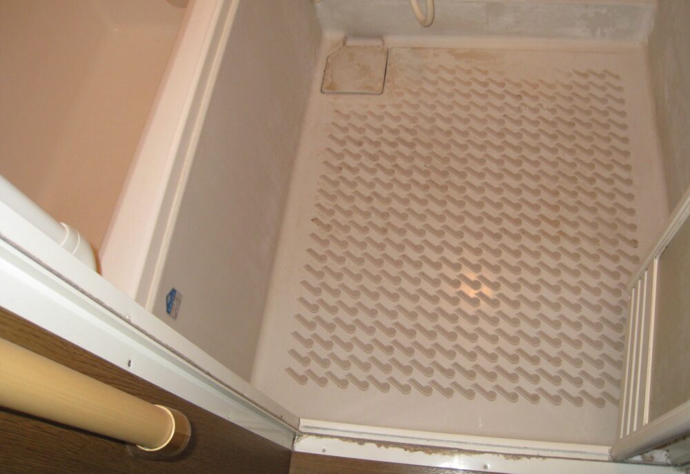 1216サイズのユニットバスの壁に凹凸の用な物があり、一部変色もありそれと収納棚も色褪せ有り、この状態だと入居者様募集できないので、きれいにお願いしますとのご依頼。